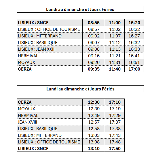 ➡️ Départs depuis Lisieux (arrêt SNCF, via Place Mitterrand) à :8h55 | 11h00 | 16h20